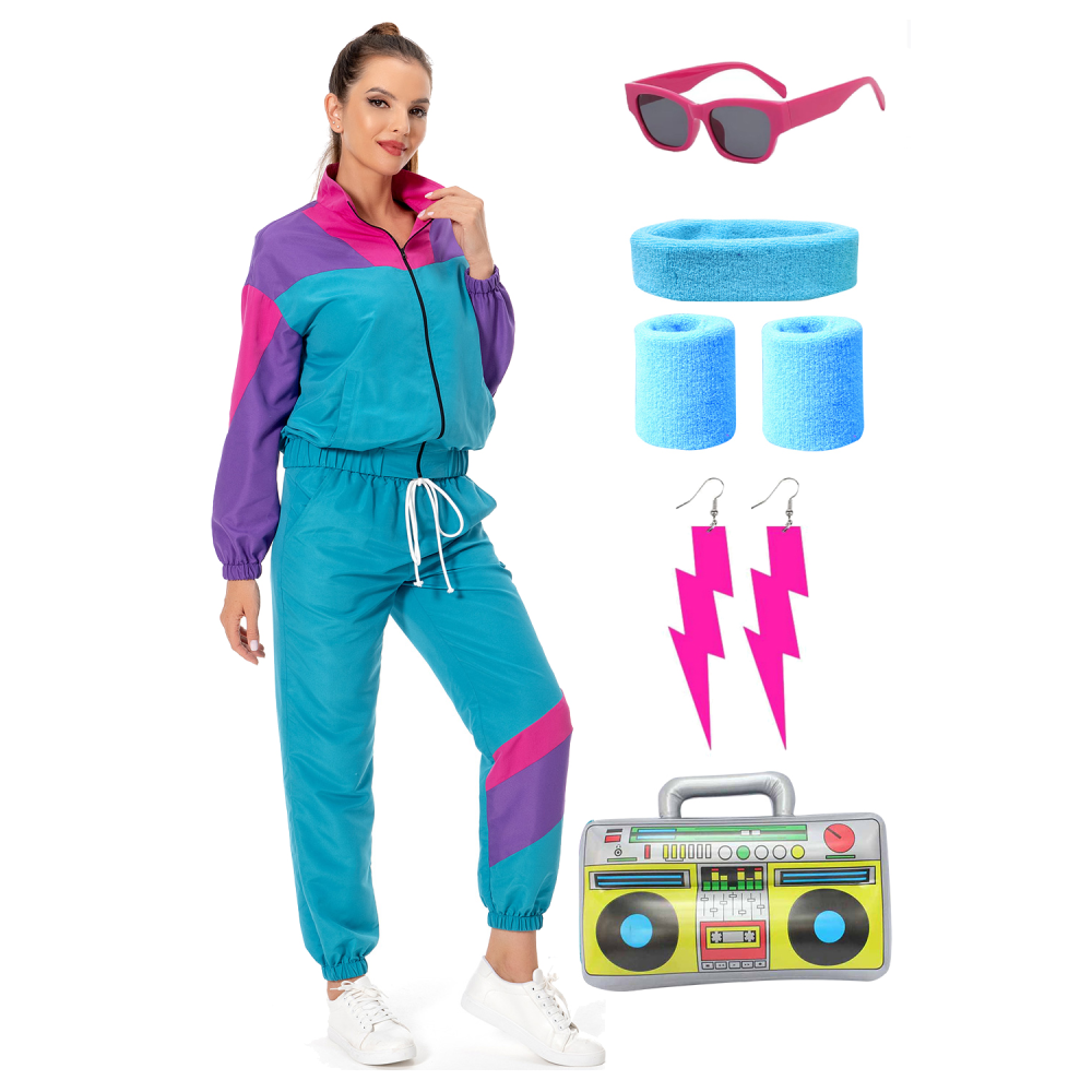 80s Tracksuit Blue-Purple 8-Piece Set Windbreaker Adult Cosplay Costume Fancy Outfit Halloween Carnival Suit