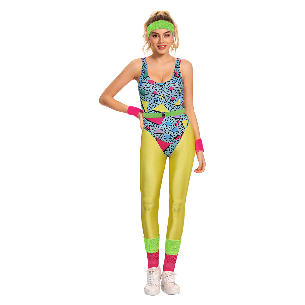 Retro 80s Women Yellow Sportswear Bodysuit 6 Piece Set Cosplay Outfits Halloween Party Suit