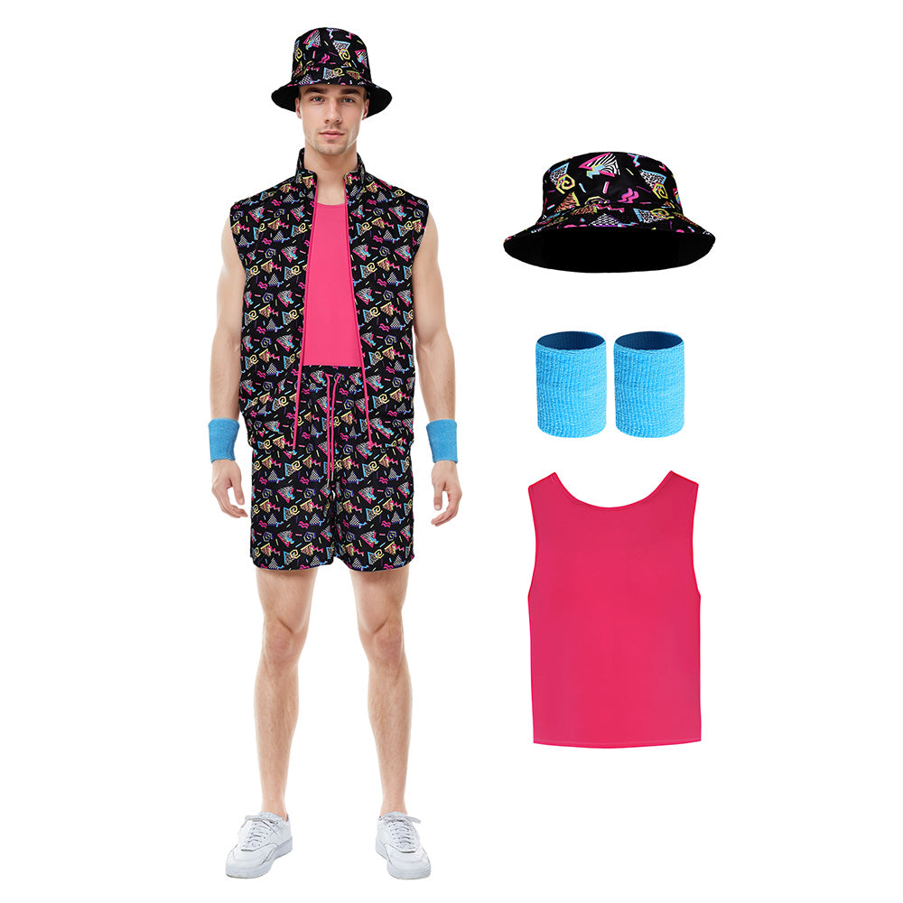 Retro Disco 6 Piece Set Adult Men 80s Printed Black Workout Clothing Cosplay Costume Outfits Halloween Carnival Suit